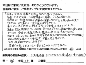 【三叉神経痛の痛みが楽になってまいりました!】Y.N様(60歳代女性)