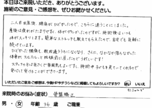 二人目出産後、腰痛がひどかったので、こちらに通うことにしました。産後は疲れがたまりやすく、身体がダルかったのですが、施術後はいつも体がスッキリします。簡単なストレッチも教えてもらえたので、自宅でも気軽に続けています。ひど […]