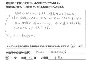 オスグットと診断され、整形外科では、安静、運動禁止をすすめられ、何か治療、できることはないかと思いこちらに来ました。 1回の治療で痛みがなくなり、今まで通り部活動ができるようになりうれしいです。