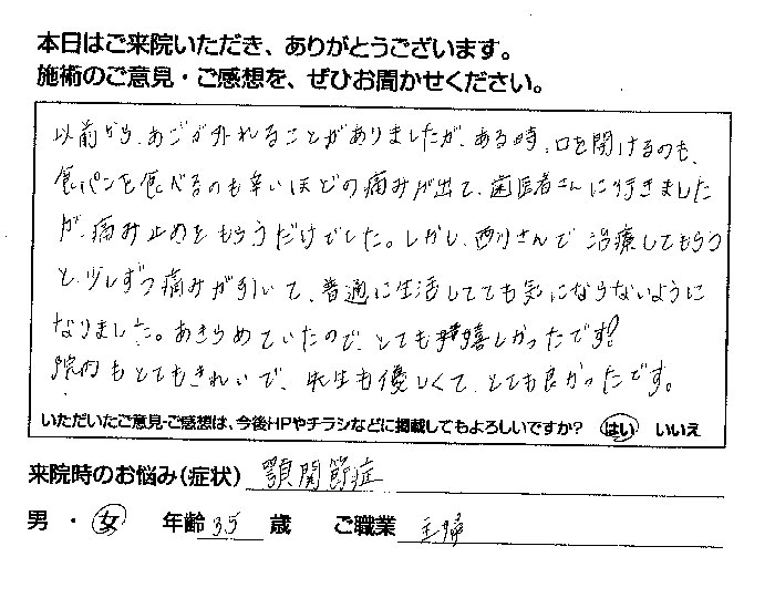 以前からあごが外れることがありましたが、ある時、口を開けるのも、食パンを食べるのも辛いほどの痛みが出て、歯医者さんに行きましたが、痛み止めをもらうだけでした。しかし、西川さんで治療してもらうと、少しずつ痛みが引いて、普通に生活してても気にならないようになりました。あきらめていたのでとても嬉しかったです!院内もとてもきれいで、先生も優しくてとても良かったです。