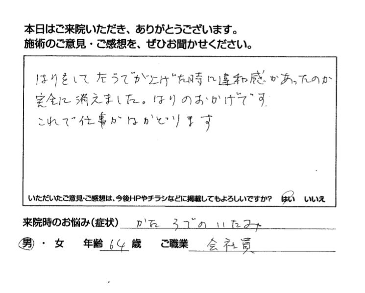 【肩、腕の痛みが消えた!】(60歳代男性) 2018年9月5日 最終更新日時 : 2025年11月17日 nkawa-admin はりをして、左うでが上げた時に違和感があったのが完全に消えました。はりのおかげです。これで仕事がはかどります。