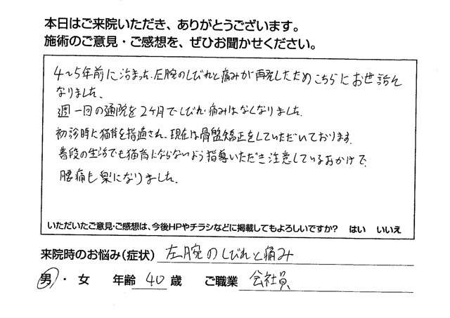 【腕のしびれと痛みが無くなった】S.S.さん(40歳男性)