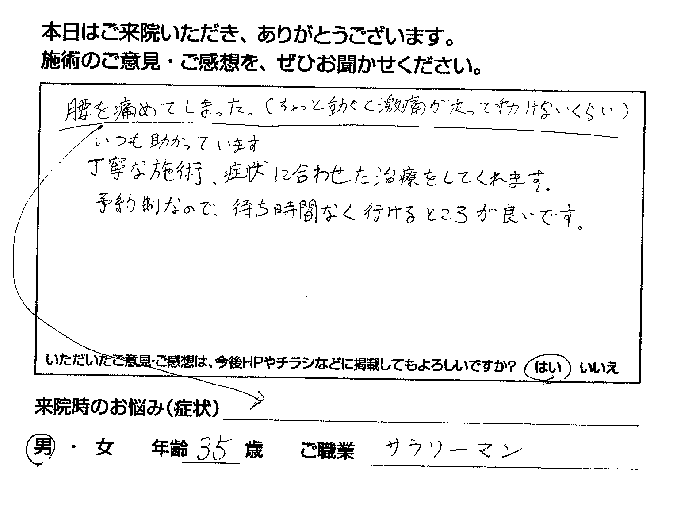 【腰痛】T.T様(35歳男性) 2018年4月23日 最終更新日時 : 2025年11月17日 nkawa-admin いつも助かっています。丁寧にな施術、症状に合わせた治療をしてくれます。予約制なので、待ち時間なく行けるところが良いです。