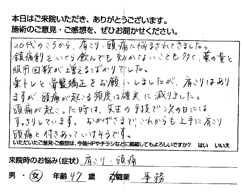 頭痛が起こった時は、先生の手技で次の日にはすっきりしています。おかげさまで、これからも上手に肩こり頭痛と付きあっていけそうです。
