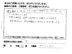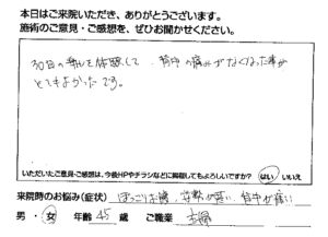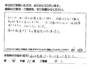 初日は重い体の状態を聞いて頂き、治療方法など丁寧な説明を受けて安心しました。又治療を行くたび体調等聞いて下さり、うれしく思いました。痛みを我慢せず先ずは整骨院に行くと思う。
