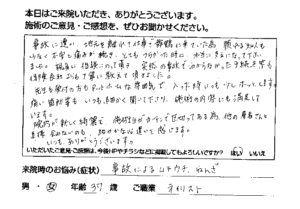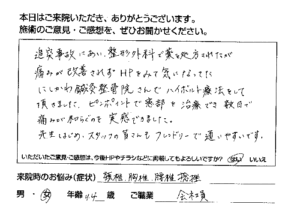 【交通事故治療、薬で改善されなかった痛みが和らいだ!】匿名(40歳代女性)